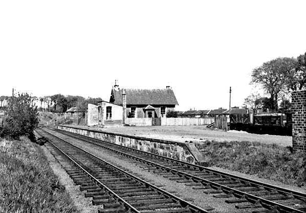 ![]() Station Name: GLENCORSE![]() Glencorse station looking north in April 1955. Glencorse Barracks are seen in the background. With the exception of Gilmerton, all ELR stations had a similar stationmaster's house at right angles to the station building.
