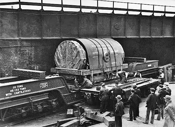 Photo from Britain from Above, reproduced with permission ![]() Not a great deal is known about this photograph taken at Mile End & Devonshire Street Yard, other than it shows a Parsons turbo-alternator on delivery to Millfields power station. Millfields was perhaps better known by its postwar title 'Hackney A' and was located on Millfields Road adjacent to the Lee Navigation, the latter not to be confused with the River Lea which the Lee Navigation incorporates. Millfields power station was isolated from the railway system, thus Mile End Yard would have been the most suitable and convenient yard for delivering the alternator from, presumably, Wallsend, Newcastle upon Tyne, where the Parsons works was and still is located albeit now part of Siemens AG. The alternator is seen on a Weltrol wagon about to be slid onto a special road trailer for the final leg of its journey to Millfields behind a tractor unit of some description. Despite the capacity of the Weltrol, the alternator would have weighed in the region of 60 - 65 tons so well within the wagon's capability. With some certainty we can date the photograph to sometime during 1931 as this plant is known to have been installed and in use at Millfields by, or during, 1932. At the power station the turbine was capable of a maximum output of 40,000 horsepower and alternator output was given as 30mw at 3,000rpm, the publicity of the time implying that these figures related to a single generator set. Although this photograph was obviously taken beside a skew bridge the precise spot is unclear but most likely in the sidings north of the main line. The wagon does not appear to be sitting on the track which passes beneath the bridge and, despite often deceptive camera angles, appears to be out of gauge