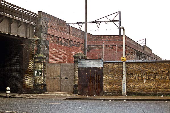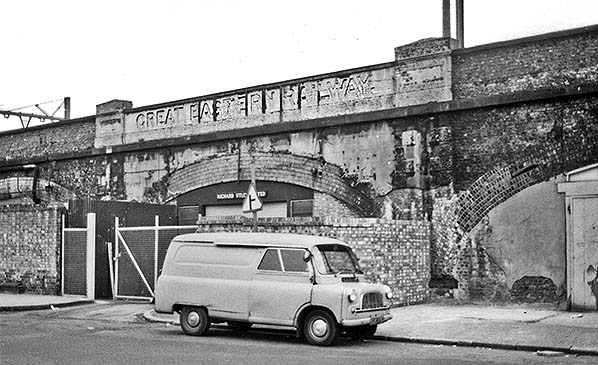 in someone's collection. Copyright photo from Stations UK ![]() This arch, seen here in 1975 in use as an office, was once open and gave access to the Devonshire Street station entrance from the south side of the line. Both it and the Great Eastern Railway name would have dated from the four-tracking of the main line and what was in effect the third station at the location, opening in 1884. The Great Eastern Railway name has not survived and today a plain brick parapet stands in its place. The road in the foreground was once the eastern extremity of what had been Upper Devonshire Street, being today part of Bancroft Road. The south side goods viaducts commenced on the right, out of view here, and the precise location is opposite but slightly west of the Carlton Arms which stands on the corner of what is now Portelet Road, formerly Carlton Road. Making sure it gets in the picture is a rather battered Bedford CA van, RJR 376G. New in October 1968, it was registered in Northumberland so in 1975 it was a very long way from its original home. The CA came with a number of body variations but was perhaps most familiar in ice cream van and caravanette form. Production ceased in 1969, the CA being replaced by the CF.