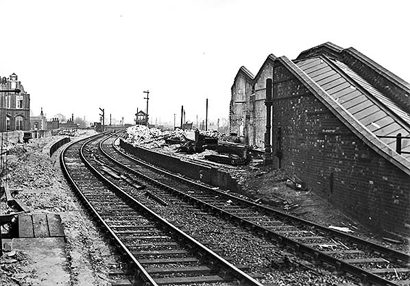 to pass beneath it. Photo from Jim Lake collection ![]() Globe Road & Devonshire Street station during demolition in 1938, 22 years after closure. This view is looking east and Devonshire Street West signal box can be seen left of centre. Beyond it is Devonshire Street goods yard, out of view at ground level on both sides of the viaduct. On the right stands one of the covered stairways which led up from the ground level; these were roofed with panes of rolled ribbed glass. The camera has somewhat exaggerated the track curvature. The fast lines, largely out of view to the right, were somewhat straighter but the curve on the slow lines was necessary to allow room for the up platform. The down platform, left, is well on its way to oblivion and beyond it, adjacent to the two off signals, is Morpeth Street bridge.