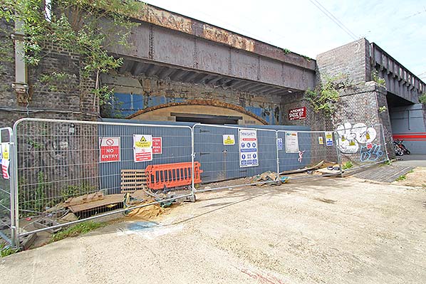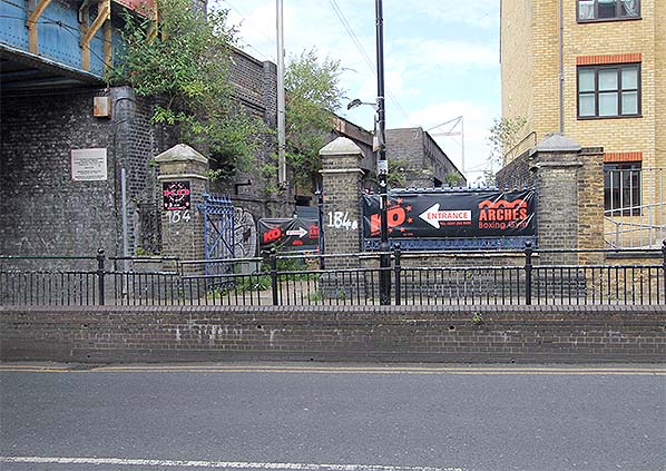 ![]() The Globe Road entrance to Globe Road & Devonshire Street station in June 2017; the booking hall was located in the first arch. A curved cast iron sign with the station name was mounted above the two gate pillars; this was removed in late 1964. A globular gas lamp was originally mounted above the sign. The gates now give access to the various businesses located in the arches; these include the KO Boxing Gym. Globe Road was once Globe Street at its northern end and Globe Lane at its southern end with the division occurring immediately south of the bridge at the junction with Upper Devonshire Street (out of view to the right), now part of Bancroft Road.