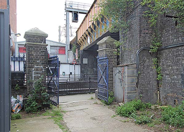 Photo by JE Connor ![]() The gates pillars for the Morpeth Street entrance in the 1990s. A curved cast iron sign with the station name with a globular gas lamp above it was originally mounted above the two gate pillars. Only the pillar nearest the bridge now survives.