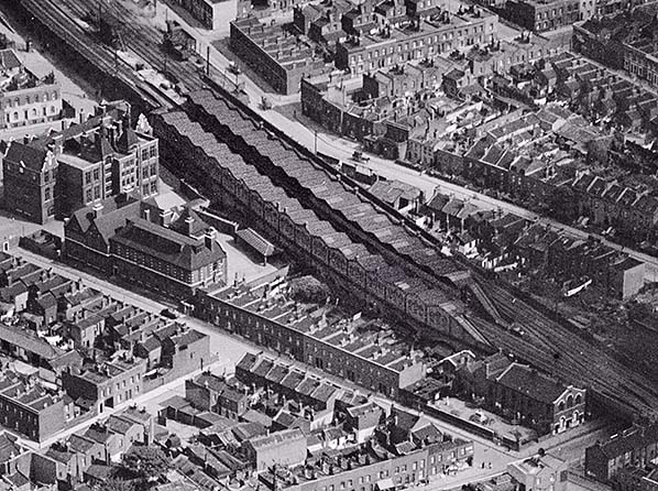 Click here for Globe Road & Devonshire Street Station Gallery 2: 1931 - June 2017 ![]() Aerial view of Globe Road & Devonshire Street station seen from the north-east in 1931, 15 years after the station closed; Globe Road bridge is seen bottom right. The platform canopies consisted of a series of ridges and furrows, with a deep, serrated valance that mirrored the ridges and furrows. This design had been popular with the GER since the 1870s. The canopies stretched for much of the platform length; only the east end of the platforms, as seen here, were not covered. The Devonshire Street West signal box is seen at the top of the picture.