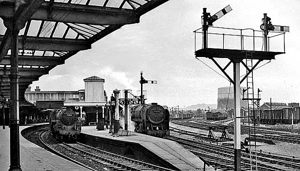 ![]() Station Name: GLOUCESTER (Eastgate)![]() Gloucester Eastgate station looking north-east in August 1963 In view are two down trains. They are a BR Standard Class 5 4-6-0 on the 16.40 from Birmingham New Street, and a BR Standard Class 7 4-6-2 on a down parcels train. In the distance the line curves round to join the GWR at Tramway Junction off to the right, past the GWR Horton Road Locomotive Depot.