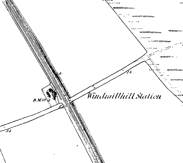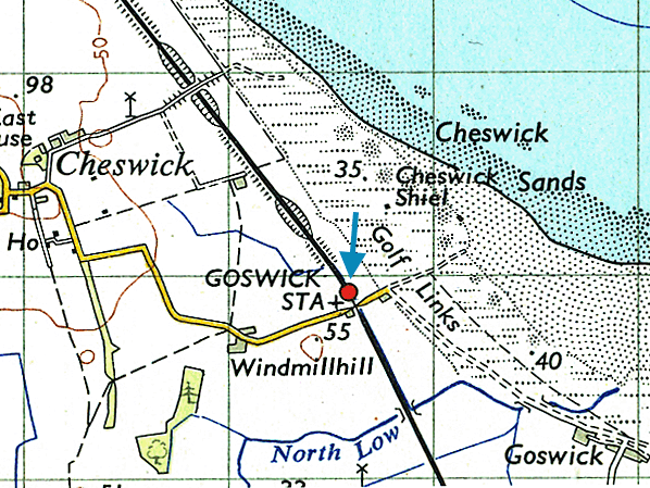 Copyreight photo from Stations UK ![]() ![]() 1866 1: 2,500 OS map. Until 1898 Goswick station was known by the North Eastern Railway as Wind Mill Hill. The Ordnance Survey version was ‘Windmillhill’. The station has not been seen in a public timetable before November 1870, but four years earlier it is marked and named on this map. It was possibly used, unadvertised, by market day trains before it officially became a public station. The station house (originally used by the crossing keeper) is shown south-west of the double-track main line, but a long siding runs from the down line north-west of the station and ends in front of the house. No platforms are shown on this map, but the position of the siding would prevent the down platform from being installed north-west of the crossing – thus it was built on the other side of the crossing while the up platform was located opposite the station house, north-west of the crossing