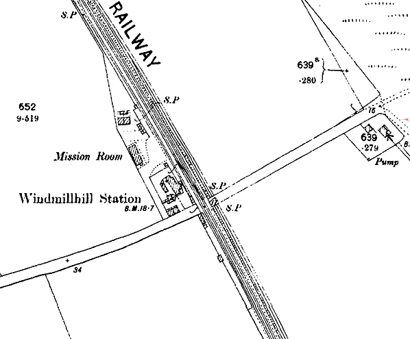 ![]() 1898 1: 2,500 OS map. This was the year when the station’s name would change from Windmillhill [sic] to Goswick, taking its new name from the links golf course which opened in 1890 and whose club house is shown about 200yd east of the station; the golf course took its name from a hamlet about a mile south-east of the station. The platforms are shown at the station, and their arrangement is ‘staggered’ with the down (northbound) south-east of the level crossing and the up one to the north-west. The platform buildings are also shown though the up platform building is indistinct. The siding between the station building and the down main line is still shown and a goods platform can be seen, approached by a roadway which also gives access to two semidetached cottages and a Mission Room – surely with little prospect of a large congregation in such an isolated spot.