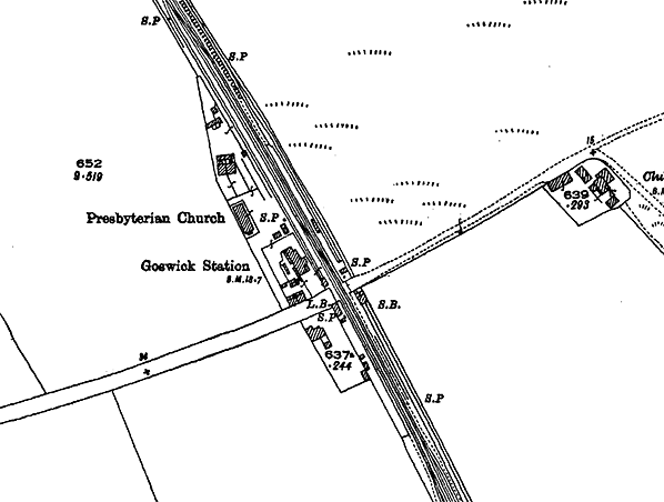 ![]() 1924 1: 2,500 map. The principal changes to railway features since the 1898 map are the station name – now Goswick – and the addition of a signal box (in 1901) on the up side, south-east of the level crossing. The platforms and buildings are represented with greater clarity than on the earlier map. The goods siding is still in place in front of the station house. The Mission Room is now shown to be a Presbyterian church. A house has been built across the road from the station.