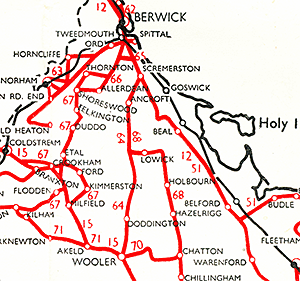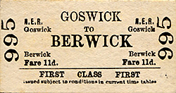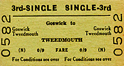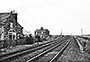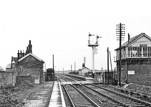 ![]() Goswick station, looking north-west from the down platform in 1958. This was the year when the station closed to passengers and it is not known whether this view shows it just before or just after closure. The brick structures in the foreground are the gents’ toilet and, beyond it – with the pitched roof – the building containing the booking office and waiting room. Beyond the level crossing the up platform has a timber building in which there was a waiting room and possibly a store. The 1901-built signal box is on the right. The chimneystacks and roof of the station house are visible beyond the down platform buildings (left) and in the background is one of the railway cottages. The goods siding was placed between the station house and the down main line, and there appears to be a wagon standing on it. The station remained oil-lit until it closed, and several of the NER-pattern lanterns are on the platforms and at the crossing.