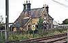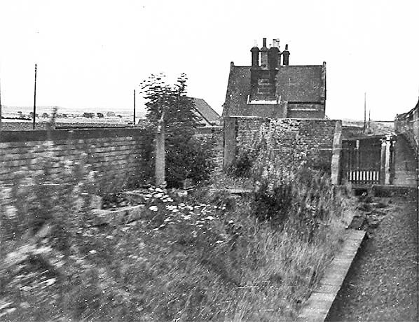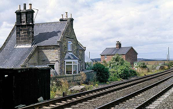Photo by John Hinson from The Signal Box web site ![]() The station building at Goswick looking north-west from the level crossing in August 1981. It was constructed by the Newcastle & Berwick Railway in 1847. Its design closely resembled the building at Smeafield , six miles south, which also began its life as a gate keeper’s cottage before a passenger station was added and the building became the stationmaster’s house. Although it is much smaller and lacking the flamboyance of the buildings at the original N&B stations it shares with them the sandstone construction, the raised gables and kneelers at the edge of the gables. As built the structure will also have been given decorative ball finials on the gable crests and the ground floor canted bay would definitely not have had the ‘picture windows’ seen on this photograph. A goods siding used to extend in front of the station building and it served the ramped platform, seen far right. Brick-built semidetached cottages, constructed in NER days, are seen beyond the station building.