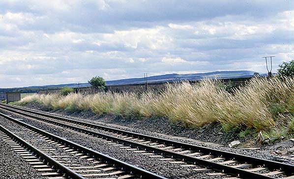 ![]() The remains of the down platform at Goswick station, looking south from the level crossing in August 1981. The platform face and much of the back-fill have been removed, but the back wall and four lamp posts, still with lantern cradles, survive. A platelayers’ hut is beyond the end of the former platform. In the distance are the Kyloe Hills/