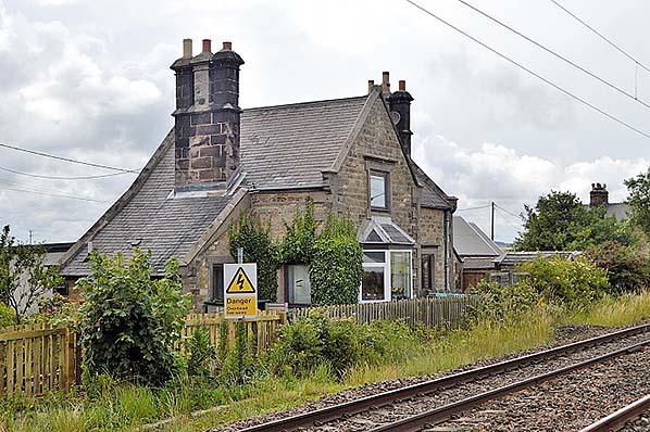 Photo by Terry Callaghan ![]() The station building at Goswick looking north-west from the level crossing in July 2015. It was constructed by the Newcastle & Berwick Railway in 1847. Its design closely resembled the building at Smeafield , six miles south, which also began its life as a gate keeper’s cottage before a passenger station was added and the building became the stationmaster’s house. Although it is much smaller and lacking the flamboyance of the buildings at the original N&B stations it shares some of their architectural features. A goods siding used to extend in front of the station building. Two railway cottages (far right) are partially obscured by vegetation.