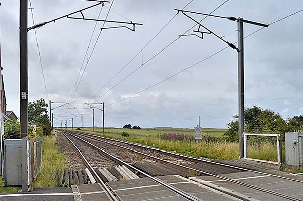 Photo by Terry Callaghan ![]() The electrified East Coast main line, looking north-west from Goswick level crossing in July 2015. The up platform of Goswick station was formerly to the right of the tracks, where the warning sign is now placed. The station building can be seen on the far left