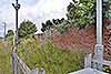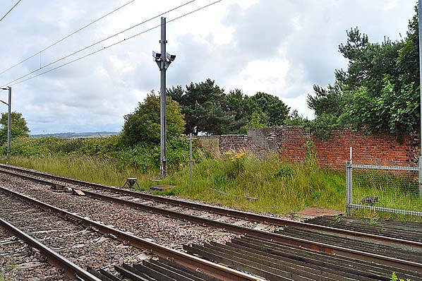 Photo by Alan Young ![]() Looking south from the level crossing at the remains of Goswick station’s down platform in July 2015 The red brickwork is the back of the booking office building and the cream-coloured brickwork beyond, largely obscured by vegetation, is the back wall of the platform.