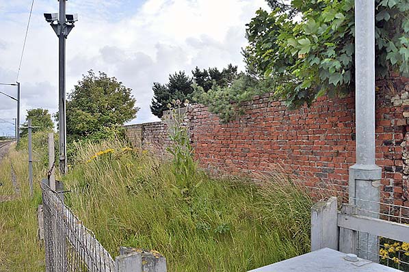 ![]() Station Name: GOSWICK![]() Looking south-east from the level crossing at Goswick in July 2015. This is the site of the former down platform of Goswick station. The red brick wall on the right belonged to the station offices, and the wall behind the teasels was probably that of the gents’ toilet. The cream-coloured brickwork which disappears into the vegetation was the back wall of the platform.