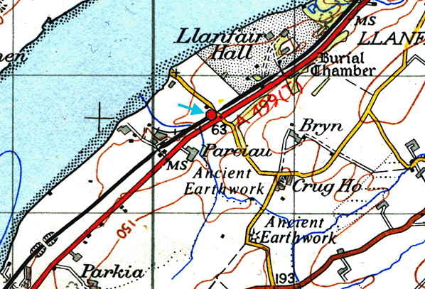There had been a siding that served the Parkia brickworks, west of Griffiths Crossing on the north side of the line. It had fallen out of use just before the Second World War but, with the start of the conflict, the works were returned to use as an underground petrol store, and an additional siding was laid. After the war the facility became the Dow Mac precast concrete works. In 1950, on the level crossing which provided access to the works, a lorry collided with the 4.04pm Bangor to Pwllheli train which resulted in the death of the lorry driver.