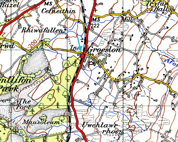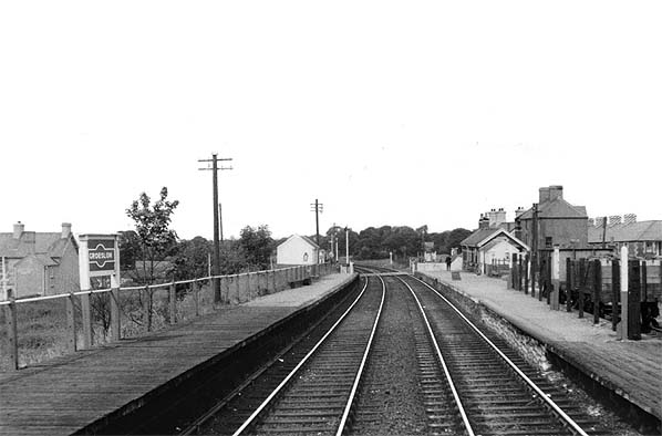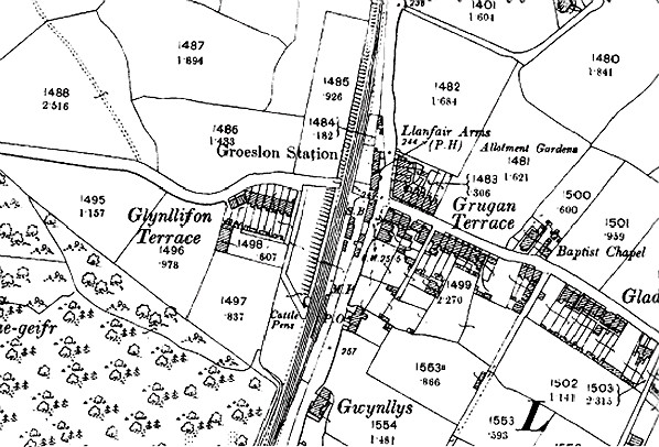 Notes: Groeslon was situated on the Menai Bridge – Afon Wen line which opened in stages between 1852 and 1871. It was in the centre of the village from which it took its name. The section of line through Groeslon was originally part of the Nantlle Railway, a horse-drawn tramway opened in 1827 linking quarries at Nantlle with Caernarfon’s quayside. Passenger services were operated between 11 August 1856 and 12 June 1865, and one of the stations on the line was at Groeslon. Facilities - if there were any - would have been basic. On 29 July 1862 the Carnarvonshire Railway (CR) was authorised to build a line between Caernarfon and Afon Wen. The CR took over the Nantlle Railway to facilitate the building of its line but, unlike at Groeslon, in many places a different alignment was constructed. In October 1866 the largely completed CR was inspected, but its opening was not approved until 2 September 1867 by which time all work was finished.