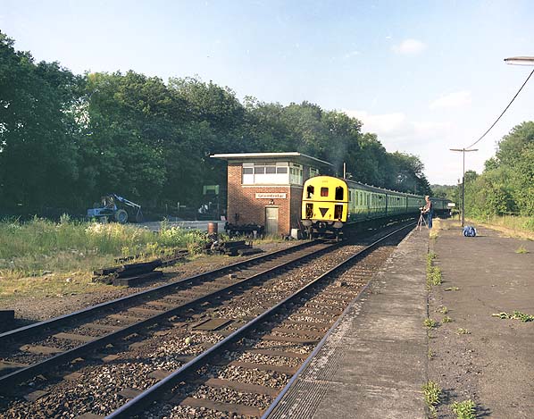 Groombridge station looking north- east on 6 July 1985 - the last day of passenger service. The Tunbridge WElls West shuttle is pulling out of the station.