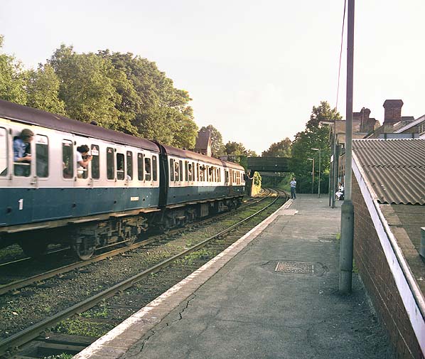 Groombridge Station looking south-west from platform 1 on 6 July 1985 - the last day of passenger service. An Eridge train waits in platform 2.