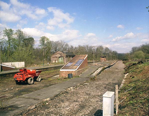 ![]() Groombridge Station looking north-east during track lifting in January 1990. The edge stones have been removed from the outer face of the island platform prior to the track being relaid past the platform for the Spa Valley Railway. The platforms, engine shed and signal box survived for another year. Photo by Nick Catford Home
