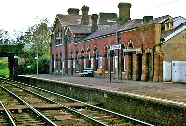 Groombridge station platform 1 seen from the end of platform 2 in May 1985