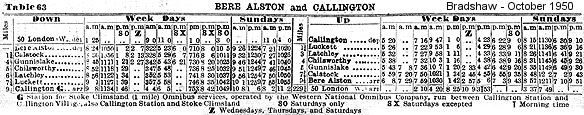 In BR days, there were 8 services daily, plus 3 more which only ran between Bere Alston and Gunnislake. From 1966 to 1968, following the closure of the line between Gunnislake and Callington, there were ten trains each way between Bere Alston and Gunnislake. This has now settled down to eight trains a day; some of which go to/come from further afield than Plymouth. |