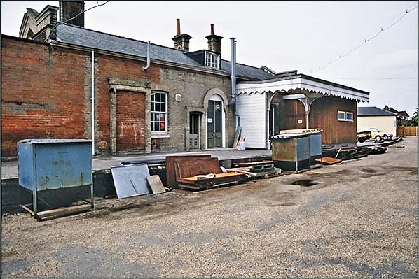 ![]() Station Name: HADLEIGH![]() Hadleigh station building in 1986; all the council paraphernalia on the platform has now gone suggesting that Hadleigh Council were no longer using the station building as a store. Wilson's corn mill is seen in the background. Note the new fencing across the track bed; for some years in the 1980s part of the mill building was let out as flats. That part of the building was eventually brought back into mill use.