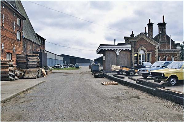 Photo by Alan Simpson ![]() Hadleigh station looking south towards Bentley in 1986. When the new road was built in front of the platform the track bed was raised by two feet. The cars are parked on the old cattle dock. Note the new warehouses in the distance while the maltings still remain on the left.