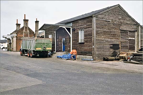 Photo by Alan Simpson ![]() One of two timber goods warehouses at Hadleigh station in 1986. This was the smaller of the two warehouses. A siding passed through the first warehouse and on into the second warehouse through the blocked opening on the right. Wilson's corn mill is seen in the distance on the far left.