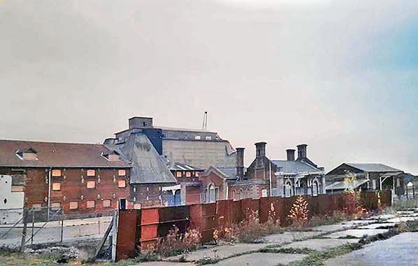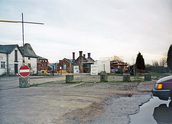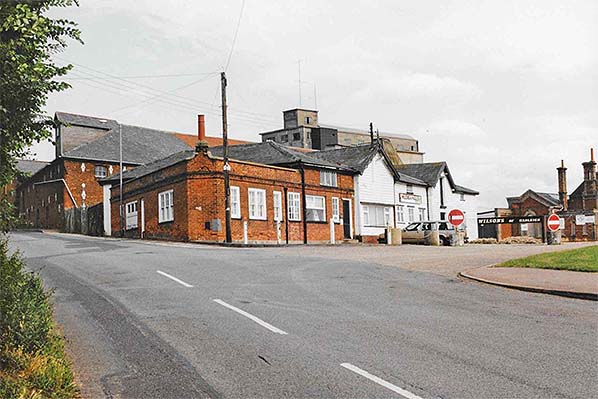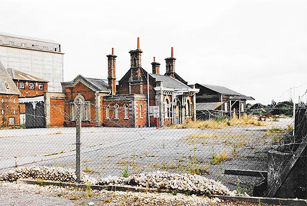 Photo by Brian Burgess ![]() Photo by Brian Burgess ![]() Hadleigh station and maltings in 1995. The site had been empty for several years and demolition of Wilson's grain silo (centre rear) is underway.