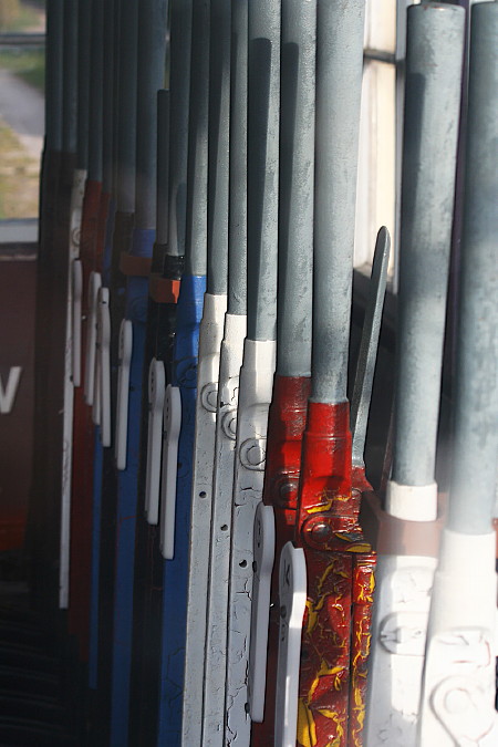 Signal levers inside the recreated Hadllow Road signal box seen on 6 April 2013.