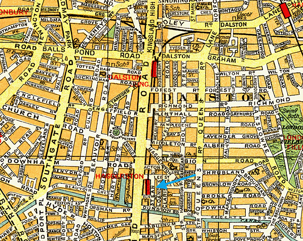 the West India Docks at Blackwall. Initially planned as a freight only line, by the time the first five mile section of the East & West India Docks and Birmingham Junction Railway opened between Islington and Bow on 26th September 1850, it was also provided with a passenger service with an intermediate station at Hackney and another at Kingsland (Dalston) opening a month later. A six road locomotive shed opened at Bow in 1850. There was a connection at Bow with the London & Blackwall line allowing trains to run into their City terminus at Fenchurch Street. The company was nominally independent although the LNWR subscribed 67% of the capital.