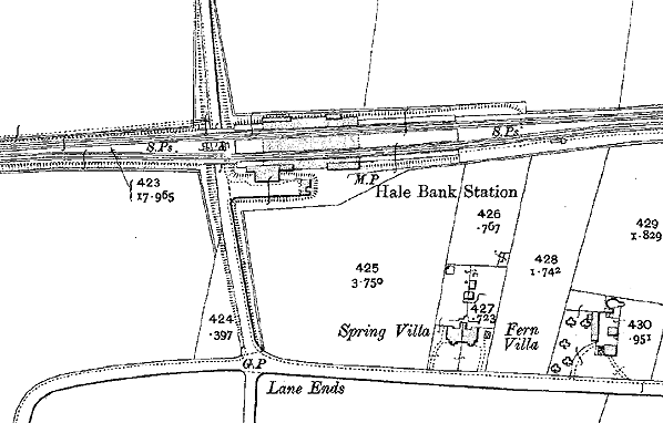 Notes: Halebank station was situated on the Garston and Warrington railway of the St Helens Canal & Railway Company (SHC&RC). The line opened in two stages from Runcorn Gap (Widnes) to Garston on 1 July 1852 and from Runcorn Gap to Warrington on 1 February 1853. Halebank station was opened as Halewood Road on 1 July 1852. It was located one mile north of Hale village and one mile to south-east of Halewood, on the east side of Burr Lane (later renamed Lower Road).