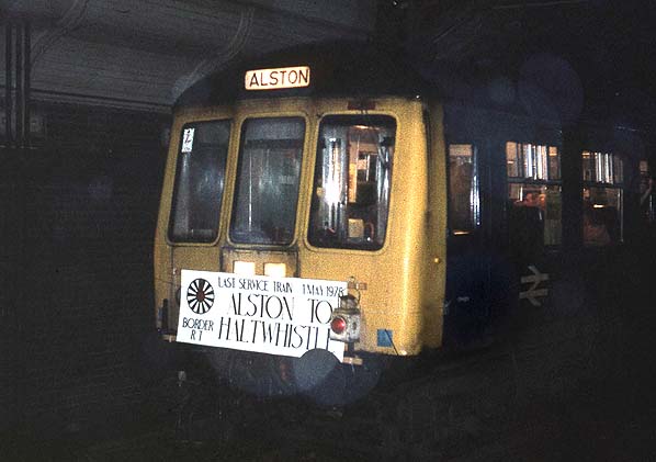 In its last months Alston was, belatedly, publicised by British Rail, who extolled the charms of the line, and offered trips by scheduled services from London. A ‘circular’ bargain-fare was available from King’s Cross and Euston, via Carlisle or Newcastle, to Alston. On the last day of service, Saturday 1 May 1976, some 5,000 passengers travelled on scheduled services on the branch, with yet more on special trains. The final train left Alston at 21:09 to the accompaniment of a lament played by two pipers, and the thunder of detonators. On 3 May 1976 rail services officially ended.