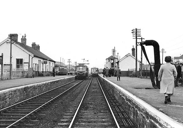 ![]() A DMU enthusiasts’ delight at Halwill, very likely on the same day as the view of No.W55031 in the down bay, seen here in the left background. At the down platform another Pressed Steel Co single-unit displaying headcode 2C61 on its rear is seen; this was the code for Okehampton - Halwill. In the Torrington bay another single-unit stands, this time one of the Gloucester RC&W cars, later Class 122. This view can therefore be dated to the 1963-65 period. Entering the up platform and either coming off the North Cornwall line or from the sidings is a 3-car DMU of what became Class 116. On the up platform is a mix of railway staff, ordinary passengers and railway enthusiasts. Whilst the latter might suggest the Class 116 is operating a railtour, there are not enough enthusiasts present for this to have been the case so the DMU is most likely on a normal service to Okehampton. The water column, right, still has its bag, suggesting steam in the area has not yet come to an end. On the wall of the station building adjacent to the Ticket Office sign is affixed a clock and a Southern 'target' nameplate. Under magnification the clock is displaying either 10.15 or 14.50. Whatever the time of day, once the flurry of activity seen here was over Halwill station would retreat into peaceful slumber for a couple of hours until the rasps of the next DMUs to arrive and depart reverberate around the surrounding countryside - and perhaps with the occasional clatter of a goods train in between.