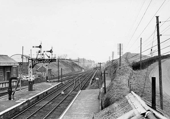 ![]() Viewed from the signal box, the diesel railcar rasps away from the bay platform on its way to Bude. The characteristic smoke from the exhaust stacks will clear after a short distance, only to reappear upon departure from Bude owing to the railcar idling in the platform following arrival. The pitched roof at right foreground was of the concrete hut, another Exmouth Junction product. The roof appears to be of corrugated asbestos and this form of concrete plus asbestos (or corrugated iron) construction was once very common. Ahead of the camera the Torrington bay platform can be seen with its apparently never-far-away barrow. From this angle it is clear how part of the hillside was cut back to accommodate the platform. It is from the top of this hill that the elevated views across the station elsewhere in these pages were taken.