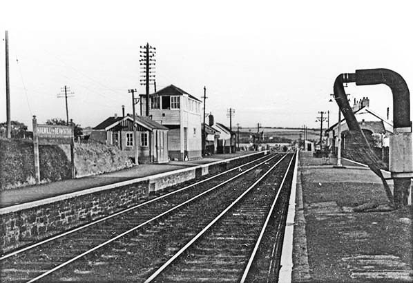 ![]() A general view of Halwill looking towards Meldon Junction and Okehampton. The main part of the station is seen here in its final form so the view is from late Southern Railway or BR days. The level crossing is closed to the railway and the only hint of any activity is the van in the bay platform although little, if anything, appears to be ongoing therewith. The water column is of note as by this time it had taken on the same hideous appearance of that on the up platform. The 'drum' object around the lower part of the column is presumably for insulation purposes as no evidence of braziers is obvious in photographs showing the columns in this form but this may depend upon time of year. On the Up platform, left, the lighter area of surface and facing may indicate alterations which took place to lengthen the platform, the lighter area being the site of the original ramp, but the darker stonework nearer the camera suggests otherwise. More likely is the lighter area being connected with changes to the points rodding and signal wires but without firm evidence speculation can last into eternity.