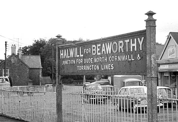 Photo by M. Taylor ![]() Halwill station’s down platform running-in board is seen here in July 1966. Of note is the still-present reference to Torrington despite that line having closed the previous year. Perhaps there was a replacement bus service, if so the board retained a little validity. On the left the stationmaster's house can be seen and on the right, with the 'Walls' sign, above a shop. The building largely hidden by the running-in board was the West Devon & North Cornwall Farmers’ Co-operative (this had no connection with the ‘Co-op’ chain of stores). Beneath the 'RR' of Torrington the Halwill Junction war memoria can be seen. A selection of period road vehicles is visible. The lorry at far left appears to be an Austin FFK. Not all others can be identified, as they are largely hidden, but what can be seen are a Rover P4 and probably a 90, behind the Rover a Mini van, to the right of the Rover a Morris/BMC J2 delivery van, in front of the shop an Austin A40 Farina and standing out from them all is a Ford Consul MkII.