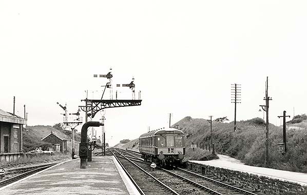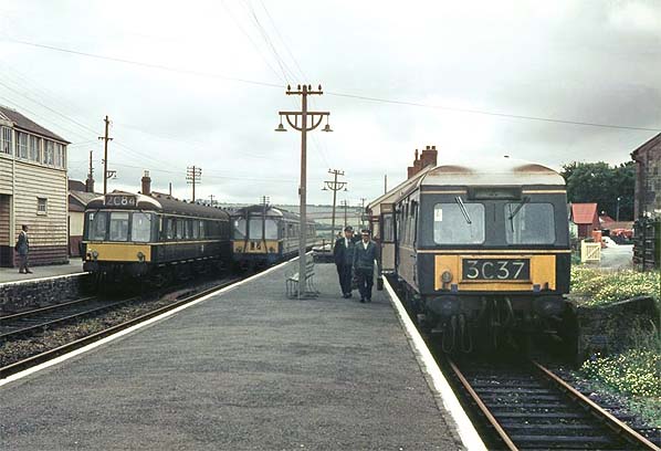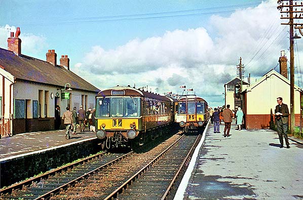 Photo by M. Taylor ![]() Halwill buzzes with activity in this view taken on 1 October 1966, the final day of service on the Okehampton - Bude/Wadebridge lines. Padstow and Wadebridge were, of course, to remain open a little longer for services from Bodmin and by October 1966 there were no trains to or from Padstow via Halwill, passengers needing to change at Wadebridge. The train on the left has arrived from the Okehampton direction and is formed of a Class 122 single-unit plus another unit of some description (a 3-car set is known have been in use on the final day as well as the single-units). The photographer did not record the time of the photograph. However, Halwill station was aligned on a SSE - NNW axis so in knowing the date and by examining length and direction of shadows we can determine that this photograph was taken during the late morning to midday period. From the timetable, reproduced on the Halwill main page, we can determine the train on the left was the 11:45 ex-Okehampton, arrive Halwill 12:06. The train then divided with the front portion departing for Bude at 12:09 and the rear portion departing for Wadebridge at 12:10. The driver of the single-unit which will form the 12:10 departure is in the cab, chatting to the driver of the single-unit on the right which had arrived from Bude at 12:07. This service, ex-Bude 11:30, continued to Okehampton arrive 12:35. The headboard on the ex-Bude unit, unreadable in this view, bore basic representations of the Coats of Arms of Okehampton, left, and Bude, right. Wording was '1898 - 1966 Okehampton - Bude Last day' and the board is known to have been fixed to the final departure from Bude so presumably was on show for most of the day and is known to have adorned the final departure from Bude at 19:35. It is worth adding a comment about the final timetable for Halwill. A study of the timetable suggests passengers to or from the Wadebridge line were required to change at Halwill from or onto Bude - Okehampton, or vice versa, services but this was not the case as the majority of services joined or divided at Halwill and thus in actuality provided through services between Okehampton or Exeter and the Wadebridge line. This was one of the advantages of diesel multiple units, making the joining and dividing of trains much simpler than with