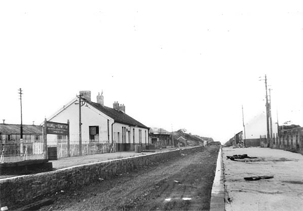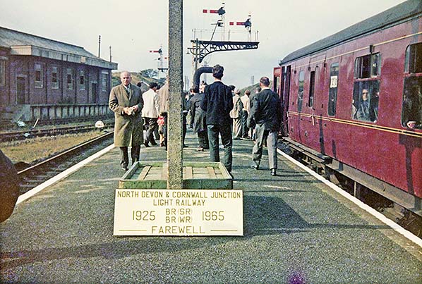 Photo from John Mann collection ![]() The sign on the platform explains the occasion. The North Devon & Cornwall Junction Light Railway was an extension of the LSWR's Torrington branch and part of the light railway had been rebuilt from its original 3ft gauge clay tramway form. The Halwill to Torrington section closed to passengers on 1 March 1965, freight other than clay traffic having gone in September of the previous year, and the Meeth - Halwill section closed completely and the was track lifted. The section between Meeth and Barnstaple, however, remained in use for clay traffic until March 1983. The carriage on the right was ex GWR and in one of its windows is a label displaying 1Z10, this being the headcode assigned to the train with 'Z' being used for any special train such as railtours, excursions or private charters. The Halwill slaughter house, which had its own loading dock, is seen on the left. Compare with early twentieth pictures. The slaughterhouse was rebuilt by the Southern Railway in 1930.