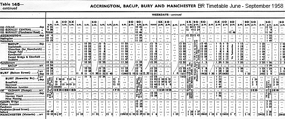 The 1849 timetable showed seven weekday trains from Haslingden to Colne, and six to Manchester which originated at Colne. Four services ran to Colne on Sundays and three to Manchester from Colne.