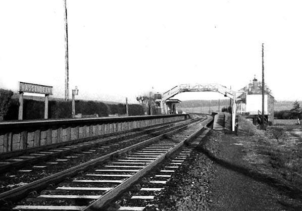 ![]() Hassendean station looking north in mid 1960s after the closure of the goods yard. The track in the yard was quickly lifted.