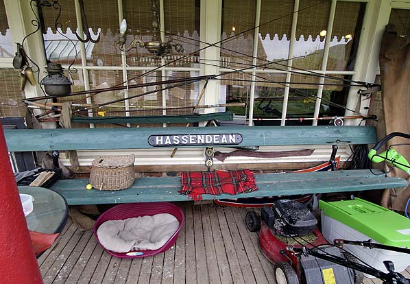 Hassendean station seat in front of the down platform waiting room in May 2011.