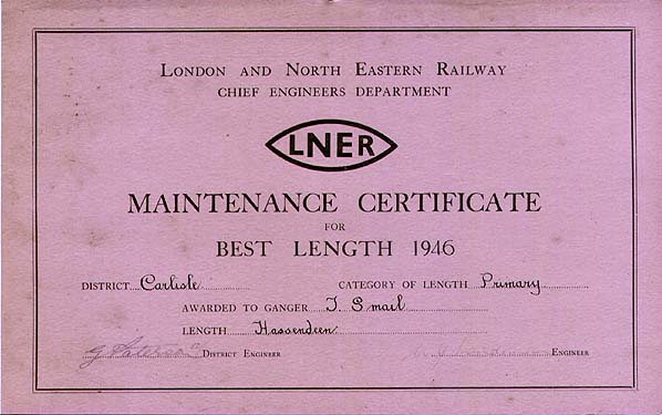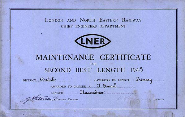 ![]() Prize lengths were first introduced on the London & Birmingham in 1838 to encourage the gangs to get the newly laid track up to standard as quickly as possible. Other railways followed, and annual prizes are recorded in the NER, NER/Scottish, LNER and early BR magazines. The LNER (NE Area) certificates were in colour surmounted by the LNER heraldic device. In LNER days they were awarded for the best lengths in Primary, Secondary, Tertiary and sidings in each District Engineer's patch. In BR the categories of lines changed to A-D plus sidings. A typical ganger's length on the Waverley route would be 3 miles of double track, and the prize length would be shown to travellers by the cut-out steel signs as preserved at Goathland. With the advent of mechanised maintenance they disappeared
