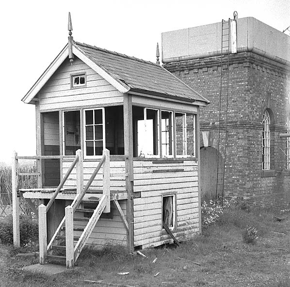 The signal box and water tower at Hawkhurst Station in September 1967. The signal box survives in good condition.