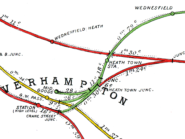 To the west of the station was Heath Town Junction where a line diverged from the W&W and curved eastwards to form a connection with the former Grand Junction Railway which had become part of the LNWR. There was also a line that connected to the Great Western Railway (GWR) Wolverhampton Low Level station which lay to the west of Heath Town Junction.
