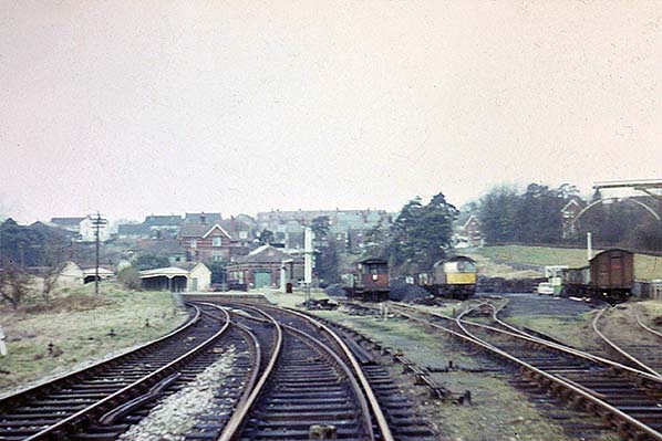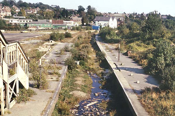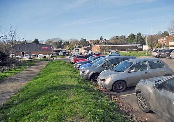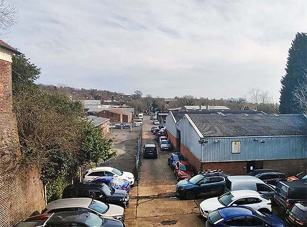 Looking south from Station Approach bridge in March 2019. The station and goods yard have been an industrial estate since the 1980s.