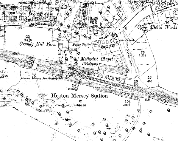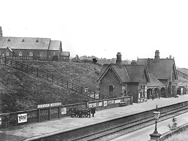 Work began on the line in 1878 and Heaton Mersey was to be its most southerly station. The junction that connected the South District line to the CLC giving access to Stockport Tiviot Dale was less than a mile to the south of the station site. The station was located in a cutting and was provided with two platforms. The main station building was located on the southbound platform. It was brick-built in a style that had been used on the CLC main line of 1873 between Liverpool and Manchester. The |