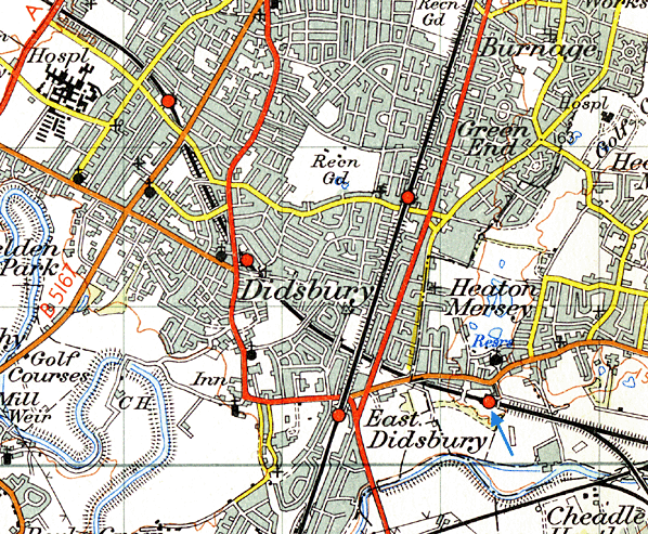 Mersey, and they finished on Sunday 4th May 1969 when the very last train services operated out of Manchester Central. The odd freight train continued to pass through the station site during the summer of 1969, but on 17th August the line was disconnected at Chorlton Junction. It was lifted in 1970. After closure Heaton Mersey station was demolished, and the cutting in which it stood was used as a landfill.