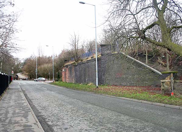 ![]() The remains of a bridge across Vale Road in February 2009 which was approximately ¼ mile to the south east of the station site. Although the actual junction was closer to the station (Heaton Mersey Station Junction), the lines split near here, one line heading for Stockport Tiviot Dale, the other (newer) line crossing the River Mersey towards Cheadle Heath.
