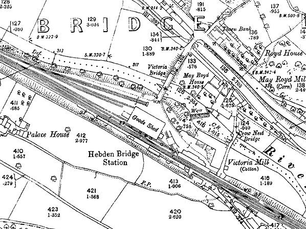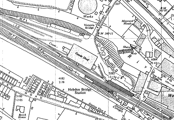 In the 1870s waiting accommodation was added at Hebden Bridge on the up platform by converting the disused engine shed, and the diminutive platform shown on the Tait lithograph of 1845, reproduced below, was widened and lengthened. The local newspaper carried reports that this waiting room was cold in winter and dusty in summer, but further improvements were not made until the 1890s. In 1872 single sidings were constructed south-east of the station off both the up and down lines, and when widening took place in 1906 these were extended to west of Mytholmroyd viaduct and converted into loops.